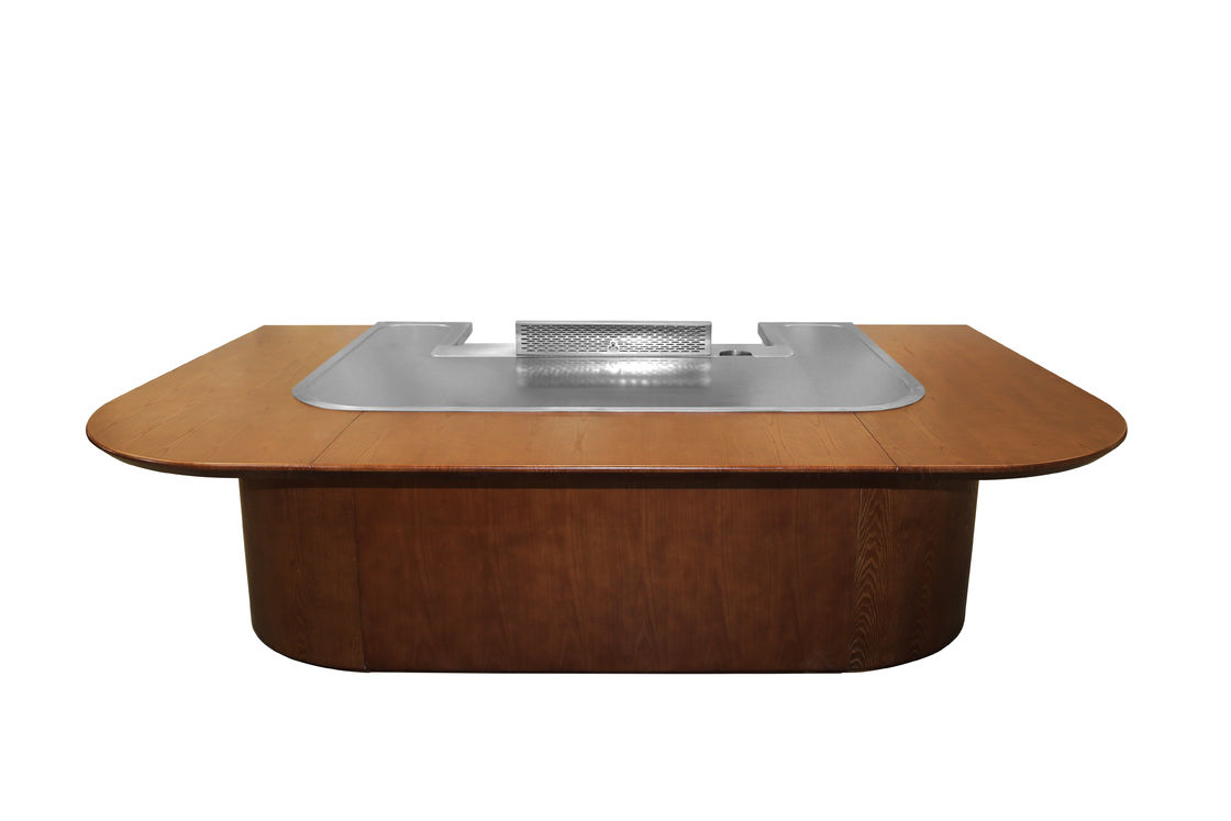Eine Teppanyaki-Ausrüstung besteht aus Maschinenkörper, Tischdekoration, Rauchreiniger und Luftgebläse. Die Kochplatte besteht aus einer Spezialstahllegierung mit einer Dicke von 20 mm, um Verformungen und Verfärbungen zu vermeiden. Die gesamte Ausrüstung ist integriert, um eine weitere Montage oder Demontage zu vermeiden.